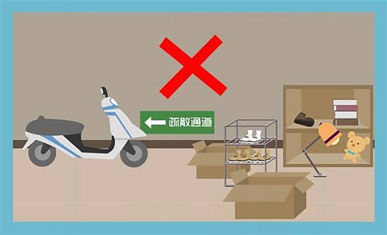 严禁在人员密集场所和住宅建筑物的公共门厅、疏散通道、楼梯间、架空层、安全出口等公共区域充电,不能将电池带回家充电。