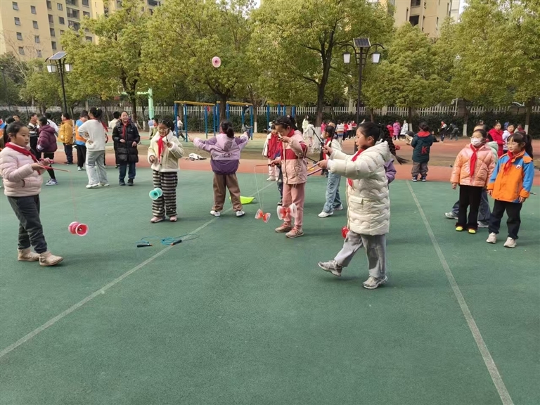 跳竹竿舞、打羽毛球、丢沙包、转呼啦圈、滚铁环、打乒乓球、跳绳……放眼望去,孩子们分散在校园的各个角落,玩得不亦乐乎,欢笑声在校园里回荡。