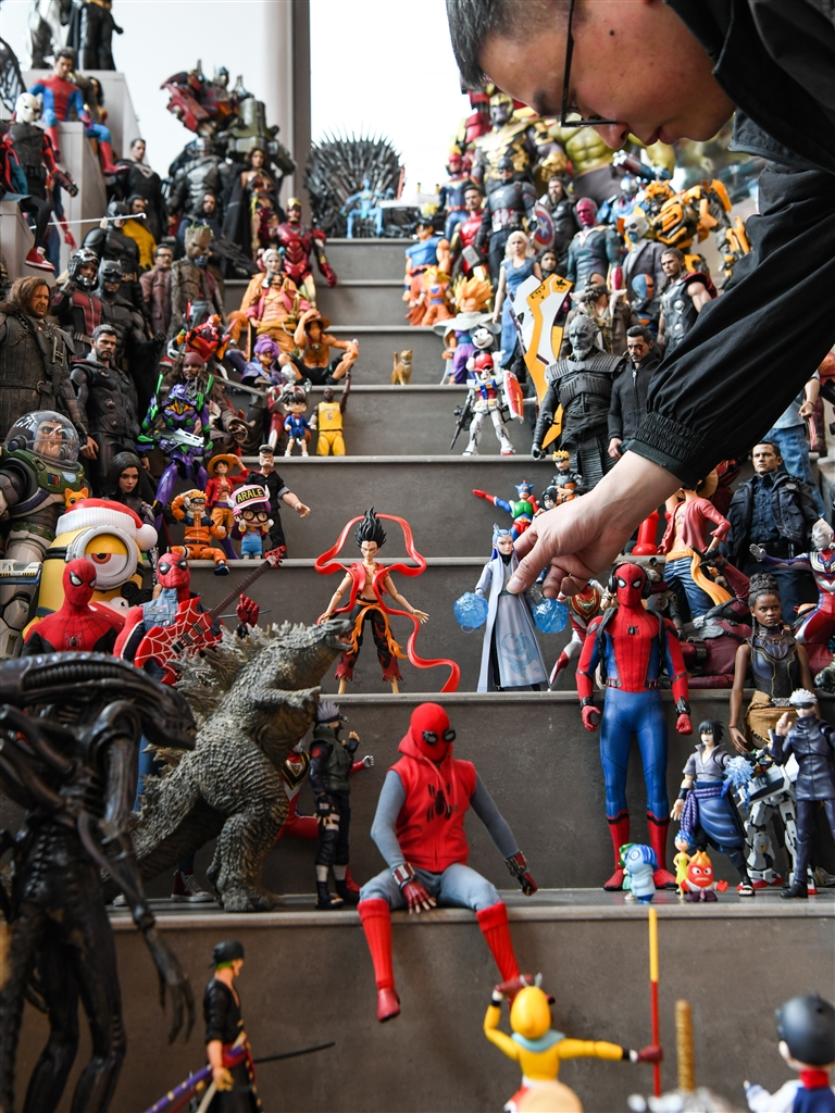 图为,在成都天府国际动漫城,曾舟在店里摆放《哪吒之魔童闹海》的周边手办。