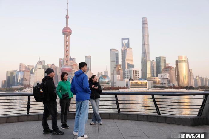 2024年12月31日,外籍游客在外滩滨江步道上欣赏城市美景
