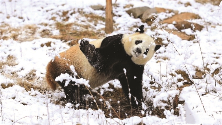 3月4日,陕西省汉中市佛坪县秦岭山区迎来春雪,秦岭大熊猫佛坪救护繁育研究基地银装素裹,大熊猫开启“撒欢模式”,时而在雪地里打滚、时而爬树“炫技”,萌态十足。图为秦岭大熊猫在雪中玩耍。 据中新网
