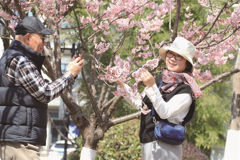 日前,新城樱花公园内,早樱竞相绽放,吸引众多游客纷纷前来观赏并留影 记者 陈永建 摄