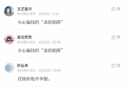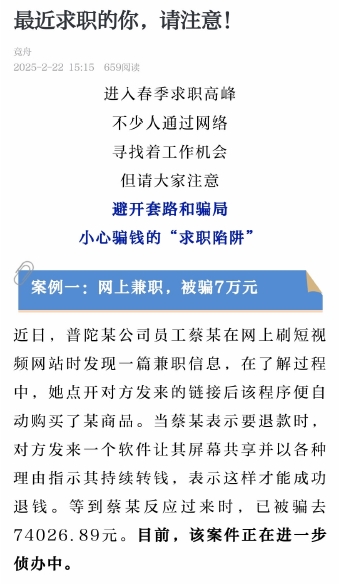 普陀某公司员工蔡某在网上了解一则兼职信息时,被骗去74026.89元;定海陈女士在某招聘网站应聘后线上试岗做任务,14483元打了水漂。据“浙江舟山公安”微信公众号消息,当下正是春季求职高峰,不少人通过网络寻找着工作机会,我市已有多人被骗。