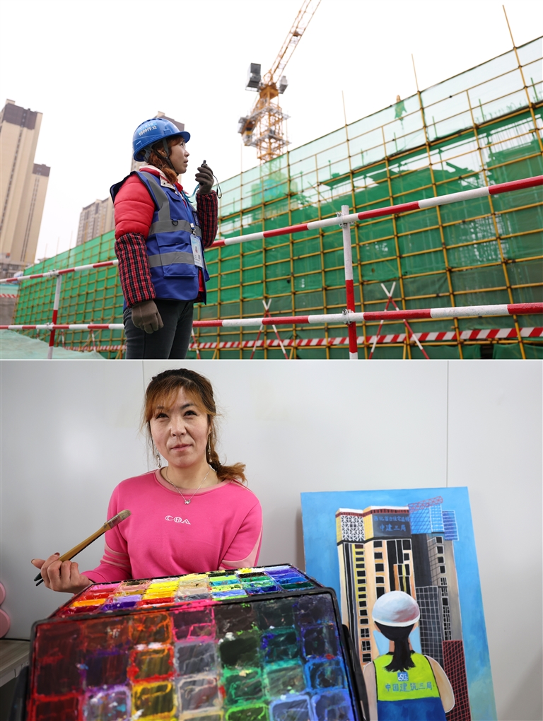 上图为40岁的中建三局兰州分公司一处项目的塔吊信号工赵巧珍在塔吊作业区进行吊装材料指挥调度作业;下图为爱好美术的赵巧珍在项目工地的活动室展示自己的绘画作品。
