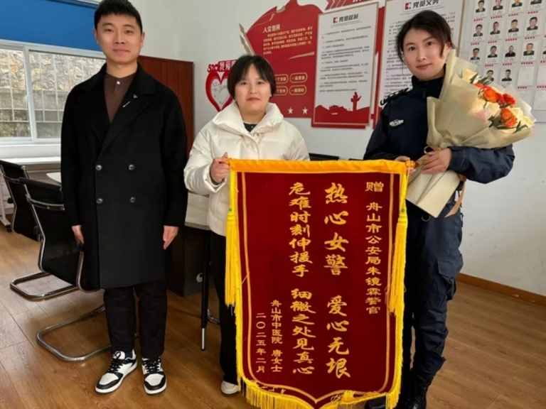 “谢谢你,千言万语都难以表达我的感激之情!”近日上午,一对夫妻带着锦旗和鲜花,专程来到定海巡特警大队,亲手将这份心意交到民警朱镜霖手中。