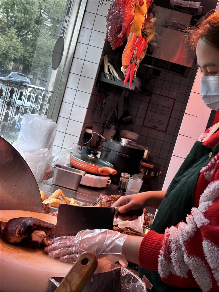 开店到现在已近两年,第一年的时候因为外卖实在太多,夫妻两个过年就没有休息。家里人也都喜欢上了这一口,一年级的女儿就特别喜欢吃猪脚,公公也喜欢吃,住在边上的街坊邻居到了饭点也会来切点烧鸭或猪脚回去,餐桌上正好添个菜。