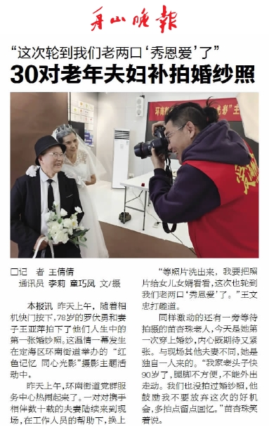 快门轻响,银丝染鬓的罗伏勇夫妇在镜头前相视而笑,洁白的婚纱与挺括的西装包裹着他们历经岁月磨洗的爱情。3月5日定海区环南街道的这场特殊摄影活动,不仅定格了30对老人的珍贵影像,更让我们读懂了“补拍”二字背后更深层的时代意蕴(3月6日《舟山晚报》报道)。