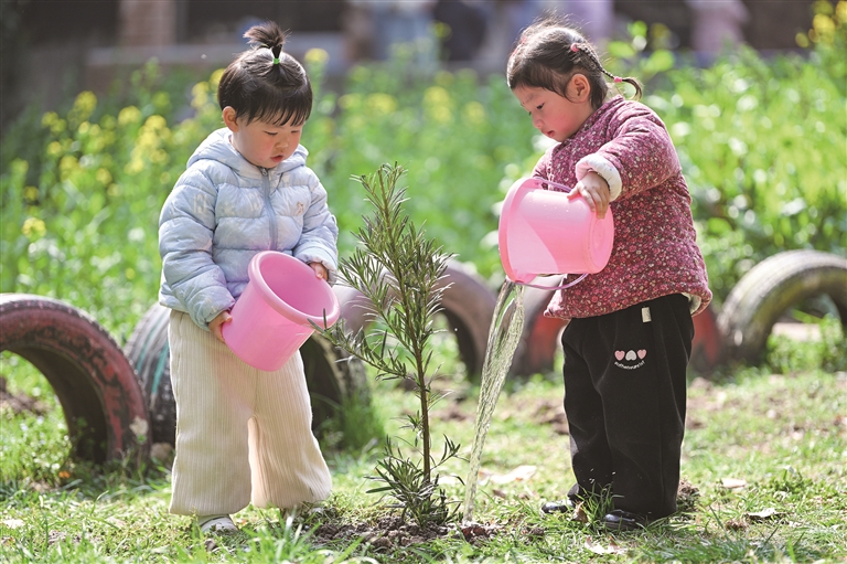 3月11日,江苏省南京市建邺区金地名京幼儿园的孩子们在校园里为树苗浇水。
