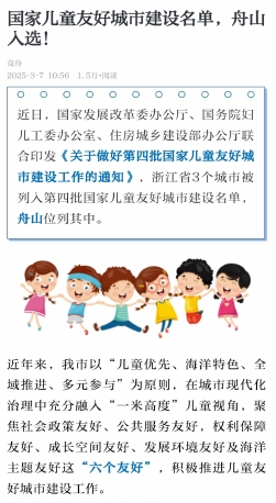 近日,舟山入选第四批国家儿童友好城市建设名单(《舟山晚报》3月11日报道)。以此为契机,深入推进儿童友好城市建设,不但有利于孩子们健康成长,还有助于全方位优化宜居环境、提升城市品味。
