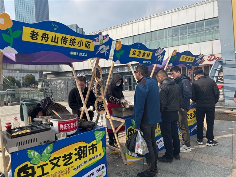塌年糕、烤菜年糕、海棠糕等舟山特色美食琳琅满目,北京糖葫芦、希腊酸奶、乳山烤生蚝、长沙臭豆腐等各地特色小吃牢牢锁住大家的胃,临近午餐时间,各个美食摊位前都排起了长队。