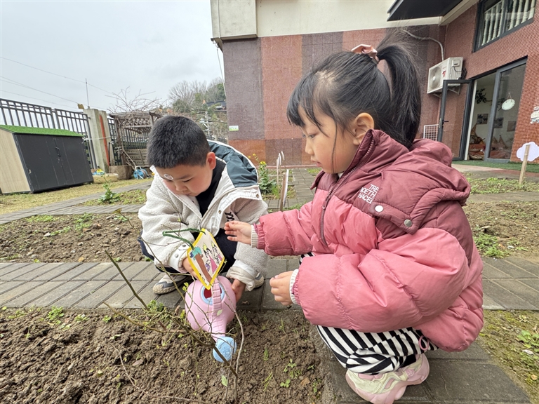 3月12日上午,普陀区城北幼儿园开展了“种个春天,浇个朋友”儿童友好主题活动。孩子们在老师的带领下,手持小锄头、小铲子、水壶等工具,合作完成了树苗栽种和浇水,并亲手为自己栽种的小树制作了“名片”。