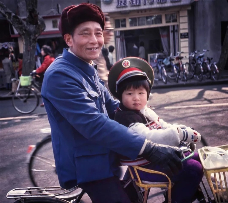 刘帆说,Tom年轻时,因工作调动来杭州待过一个月的时间,大约是1985年前后,“他是个摄影爱好者,这张照片是他当年在杭州街头随手抓拍的。当时他在街上散步,正好看到爷孙俩骑着自行车,他还特别礼貌地询问可不可以拍摄,爷爷比了个OK的手势,他就立马按下了快门,把这一刻留了下来。”