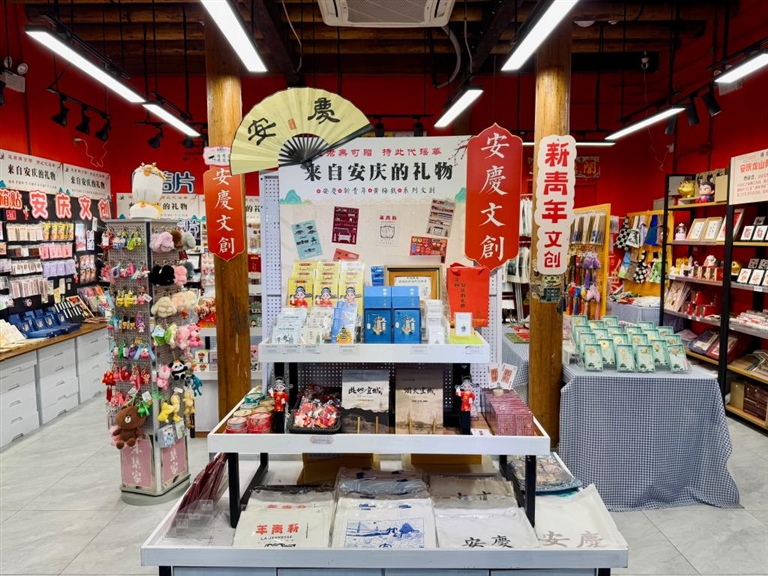 走进店铺,安庆谯楼冰箱贴、振风塔钥匙链、黄梅戏特种邮票等含有安庆元素的文创产品令人眼前一亮。