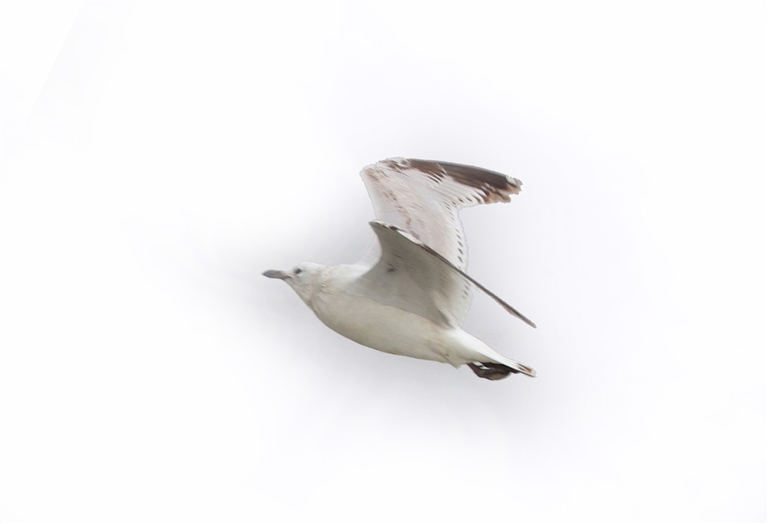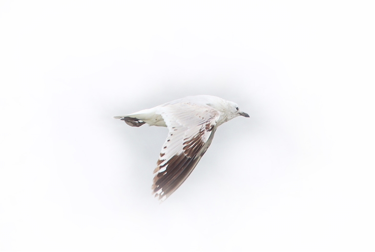 这只出现在舟山的遗鸥,个体较小,头部呈白色,眼睛上下方各具有一个新月形的白斑,飞翔时翅膀的尖端呈黑色。