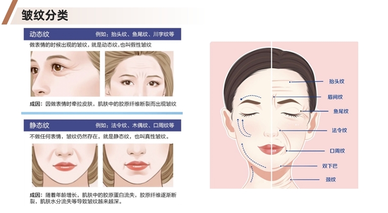 皱纹也是显老的一大“元凶”。人上了年纪,脸上的胶原蛋白流失,弹性纤维容易出现断裂,随之会出现法令纹、木偶纹、口角纹等静态纹,而做表情时出现的抬头纹、川字纹、鱼尾纹等动态纹也会越来越深。“除皱的最佳选择就是肉毒注射,经过四五十年的发展,如今肉毒注射的安全性其实很高。”张静介绍,肉毒注射除皱的原理是利用肉毒素阻断神经与肌肉的信号传递,使肌肉放松,从而达到除皱的效果,“比如一个人日常习惯性地抬眉导致额头出现抬头纹,那我们就可以用肉毒素放松他的额肌,额肌动不了,皱纹也就自然不会再产生了。”