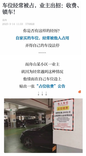 舟山某小区一业主在私人车位旁贴出一张“占位收费”公告,声明“收费标准:200元/次,占用即默认收费标准”,还提到了“占用会上锁,开锁请联系物业”等。这些内容既缺乏法律依据,也很难实际操作。虽则如此,“占位收费”依然值得探讨。