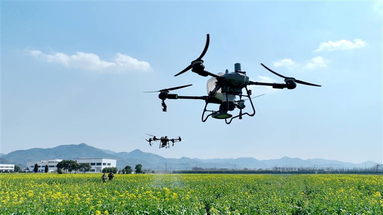 3月19日,在浙江省湖州市德清县舞阳街道上柏村油菜种植基地,无人机在进行植保作业(无人机照片)。