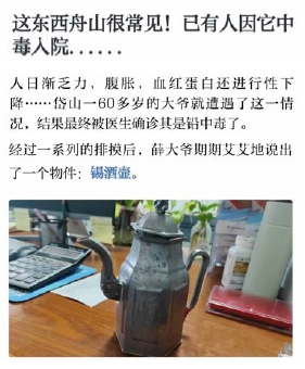 近日,岱山的薛大伯因长期把酒加热后灌入锡酒壶保温饮用,身体出现诸多不适症状,就医后确诊为铅中毒。这一事件敲响传统餐饮容器健康安全的警钟,提醒我们,重新审视那些习以为常的传统容器能否使用。