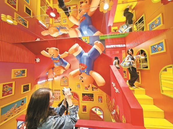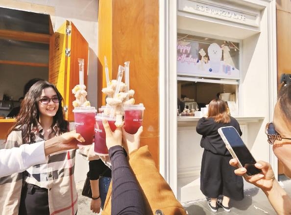 这些“人无我有”的新型业态吸引了喜欢明星的、喜欢拍写真的、喜欢晒朋友圈的、喜欢尝鲜的、喜欢做直播的……各类年轻人前来打卡。记者在WiggleWiggle看到,狭窄的楼梯上挤满了上上下下的人,尽管前面人的脚踩到了后面的人,年轻男女们仍费力地挤上楼,在各种可爱的毛绒玩具和空间陈设前拗造型拍照。13DE MARZO咖啡店更是人山人海,这个被称为韩国和泰国游客必到打卡点的咖啡店是拍照胜地,等待的顾客在店内打卡点和巨型小熊合影,拿到了咖啡的顾客则迫不及待地举起咖啡对着天空拍照。记者观察了一会儿,几乎没有人拿到咖啡后不拍照的,这只呆萌的小熊可谓是拿捏住了流量的密码。