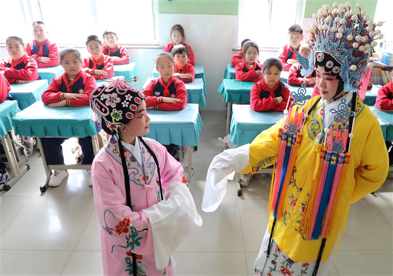 3月25日,在山东省滨州市博兴县第三小学,“京剧社团”的小学生给同学们表演京剧选段。