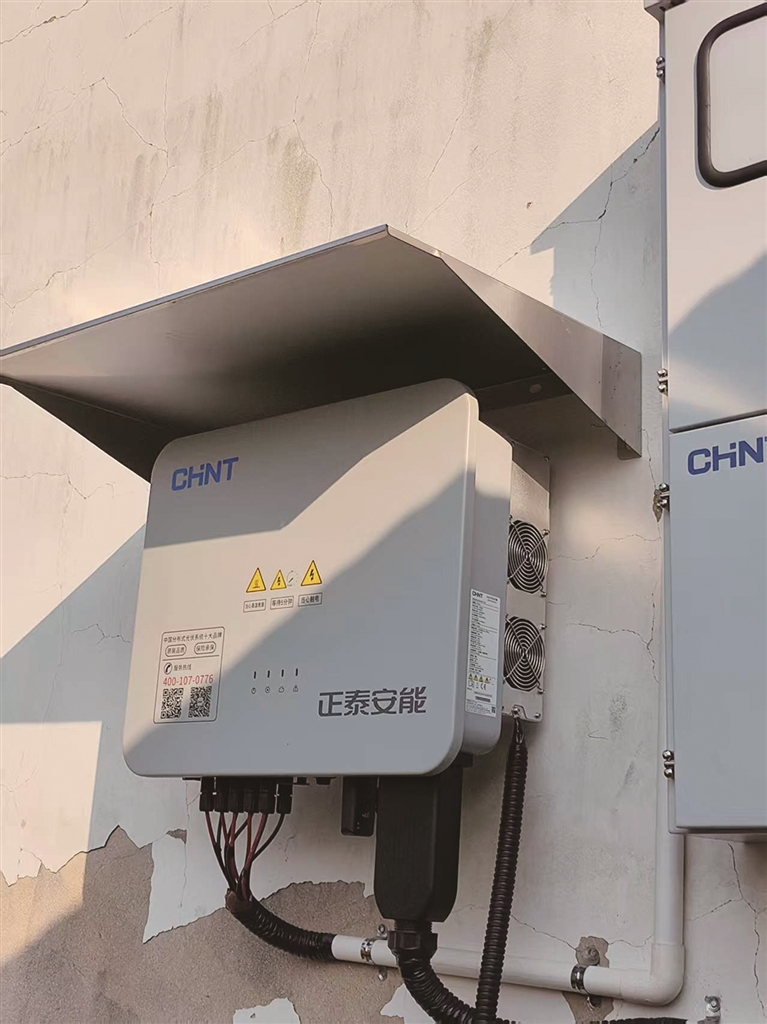 在房屋的墙面,挂着光伏的“汇流箱”。上面有正泰集团的企业标识“CHNT”以及企业名称“正泰安能”。