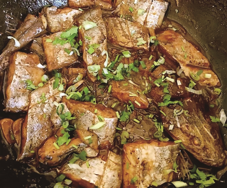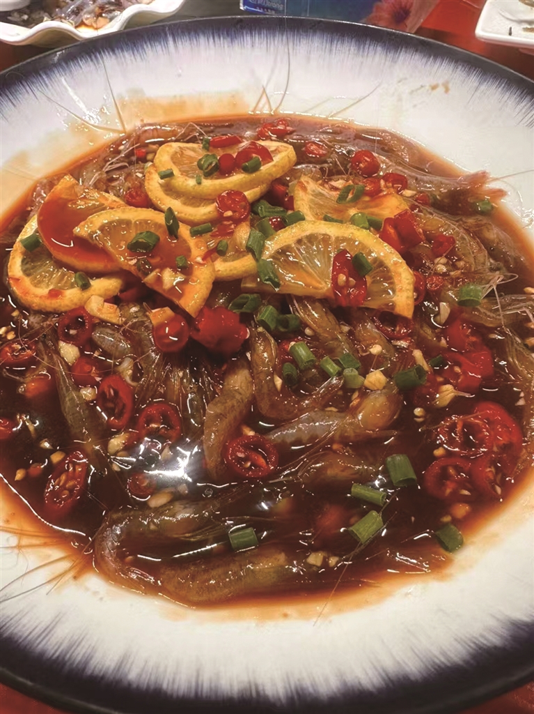 这就像开盲盒,每道菜都是惊喜。他调的酱红的醇香生腌汁,再搭配红的辣椒、绿的葱花、黄的柠檬片,半透明的虾子在红汤中若隐若现,上桌便勾起满满的食欲。哪怕只是简简单单的一道红烧杂鱼,锃亮的鱼身,浸润在红烧酱汁中,面上一把翠绿的小葱花。上桌,“色”已迷人眼,再一尝这味儿,真是色香味俱全。看来老板今天心情不错,烧的菜就和心情一样好。