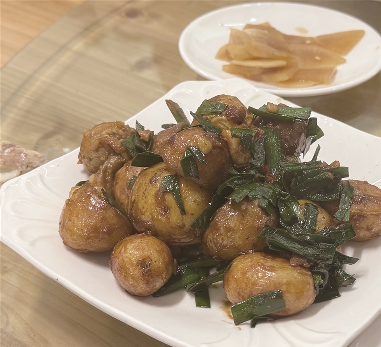 一个好的厨师,总会苛求食材。海鲜仍然是小渔船上拿来的新鲜海货,其他的食材也挑选自原产地,前一阵子,店里上新的小土豆就获得不少赞誉。是来自湖北恩施的小土豆,个头小小,口味软糯,用来炒韭菜,或者做椒盐土豆,都是好味。卢云福也喜欢帮客人配菜,每天到货的食材不同,那就有啥吃啥。