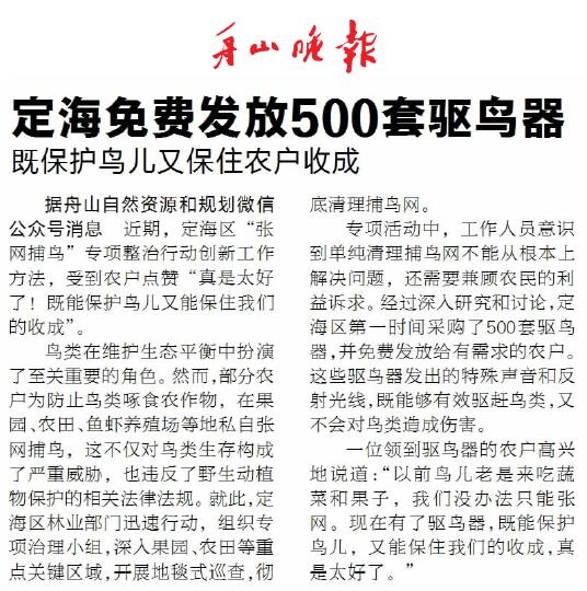 定海区林业部门在专项整治“张网捕鸟”行为的同时,采购500套驱鸟器免费发放给有需求的农户。“以前鸟儿老是来吃蔬菜和果子,我们没办法只能张网。现在有了驱鸟器,既能保护鸟儿,又能保住我们的收成,真是太好了。”(《舟山晚报》3月31日报道)