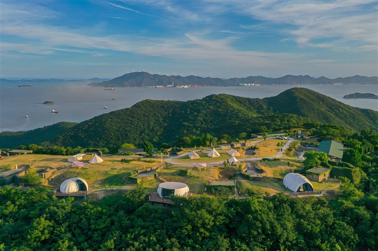 海风轻拂,沿着岛上的路标拾级而上,用不了一首歌的时间,传说中的“见山海”露营基地就映入了眼帘——蓝天为幕,草坪作席,一顶顶帐篷和花儿们一起“盛开”。“就像置身巨幕影院,360°山海美景尽收眼底。无须开滤镜,随手一拍就是一幅画。”来不及发出“哇哦”的赞叹,郑杰一下拧开相机镜头盖,“咔咔”一顿拍。