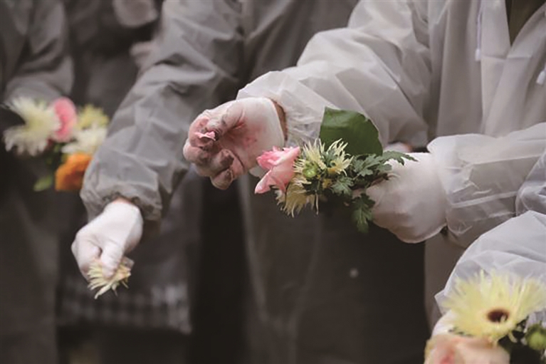 简短的仪式后,师生们将骨灰安放入方形墓穴,轻轻剥落白色、黄色的菊花花瓣,随后撒下,覆上一层黄土。所有参与者在墓碑前鞠躬,肃穆默哀后献上鲜花,寄托哀思。