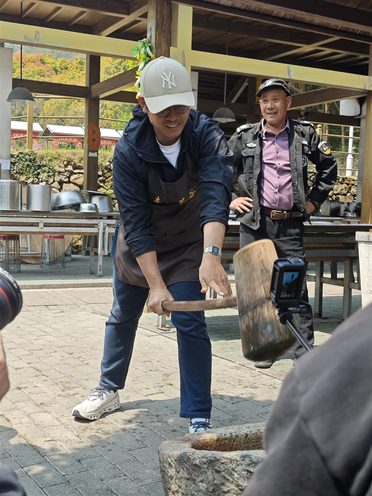 在新建村农家土灶体验区,船东代表们学做起舟山青饼。抡起木锤搡艾青糯米团,再把它放在模具按压……今年22岁的杰拉尔迪很快就做好了一只青饼,“我的家乡没有这种食物,这是第一次品尝,我觉得味道很不错。”
