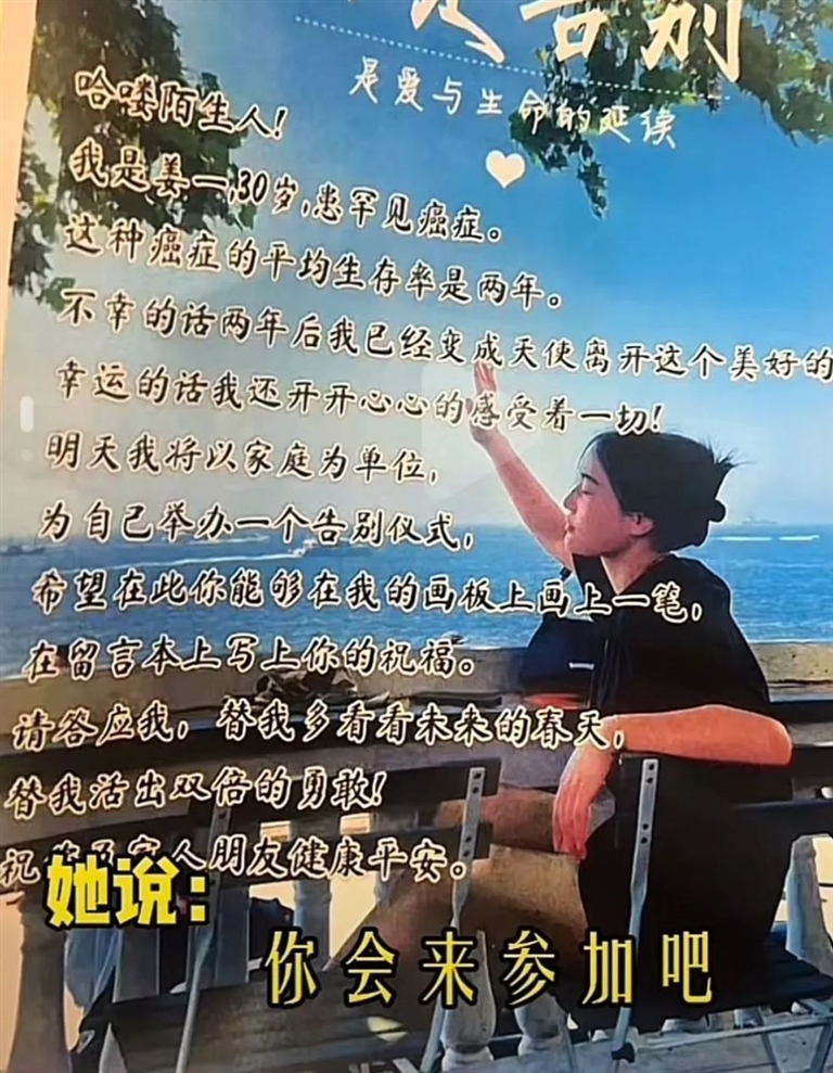 “如果生命是一本书,我这一页或许比别人短,但每一行都写满了爱与惊喜。我们并不惧怕死亡,生命的意义从来不在长度,而在于我们如何拥抱每一个当下,如何在有限的时光里给世界留下一抹温暖的色彩……”小姜在视频里这样阐述举办“生前葬礼”的初心。