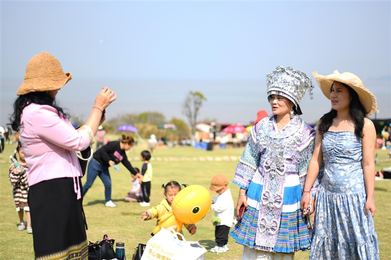 近日,普陀螺塘线“最美公路”,来自云南的苗族、傣族等少数民族游客身穿传统民族服饰在海边拍照,欣赏山海美景 记者 姚凯乐 摄