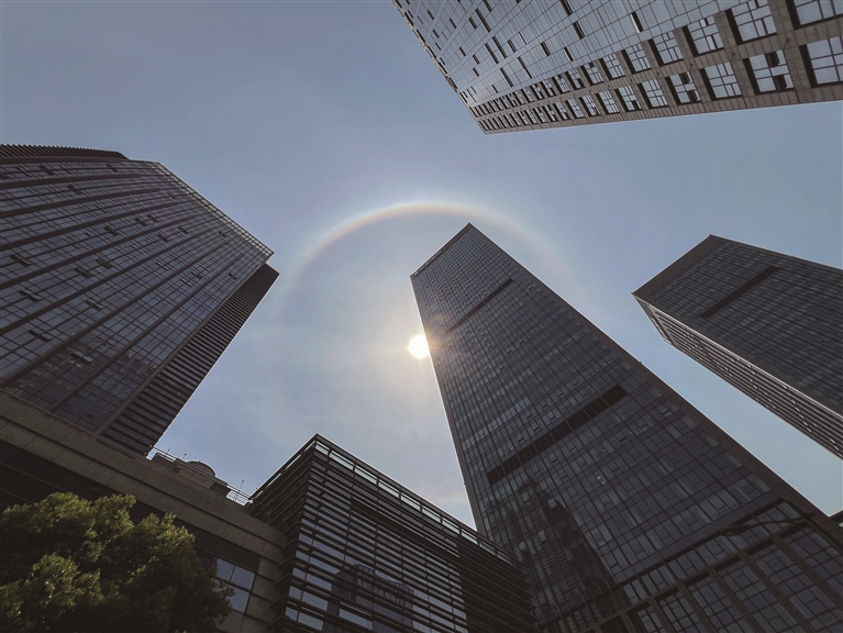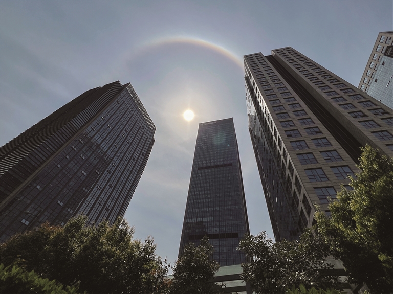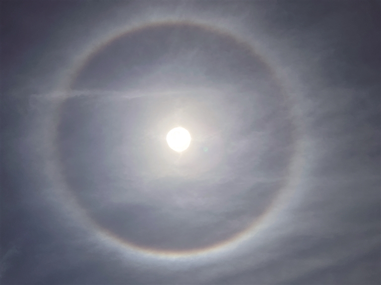 记者了解到,日晕又叫圆虹,是一种大气光学现象,是日光通过卷层云时,受到冰晶的折射或反射而形成的。当光线射入卷层云中的冰晶后,经过两次折射,分散成不同方向的各色光。日晕除了美丽的环形外,有时还会呈现弧状、光点状,甚至是多彩的样子。这主要取决于冰晶的形状、大小、排列方式以及光的入射角度。