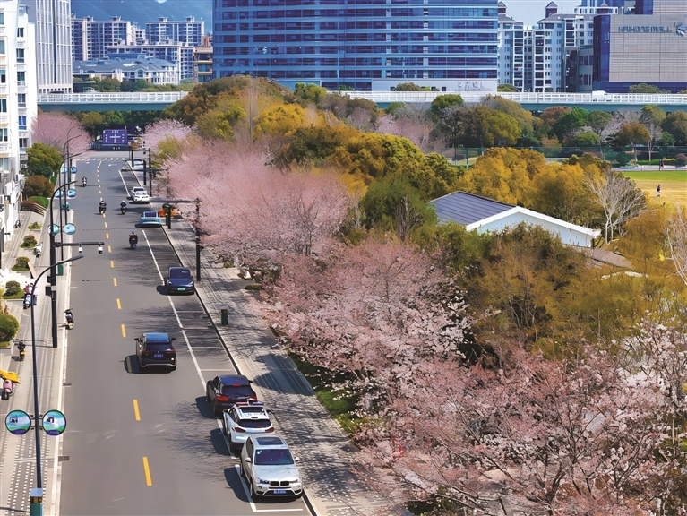 海华路与海莲路上,樱花、紫荆花等绵延成片,粉白相间的花瓣层层叠叠,在阳光下泛着柔光。