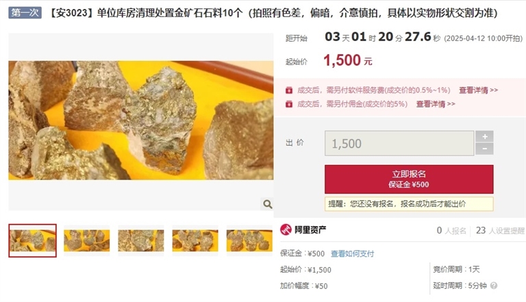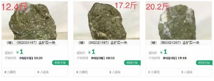 黄金价格扶摇直上,正规渠道买黄金可得花不少钱。不过,在公开的阿里资产网上,屡见有成色不明的金矿石上架拍卖,起拍价甚低,一百元甚至1元起拍,一般数公斤重的金矿石,最后的成交价在数百元至千把元。