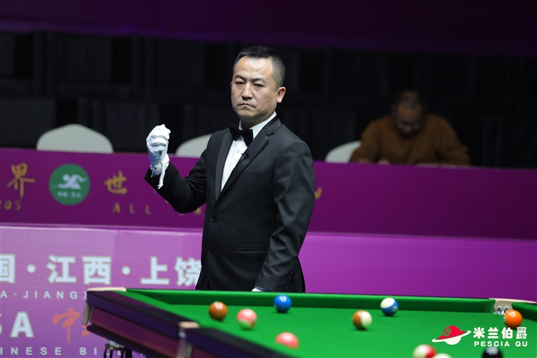 2022年底,我执裁了一场中国中式台球国际精英赛的半决赛,对阵双方运动员是郑宇伯和赵汝亮。比赛在1号TV台举行,有6台摄像机同时对着这张台球桌,台下的观众席也是座无虚席,各种镜头都对准了这场巅峰对决,现场气氛非常热烈。我在执裁的同时,还要维护场边的观众,因为他们用闪光灯拍摄,会影响到球员的发挥。最终我以零失误的判罚,完成了这场工作。
