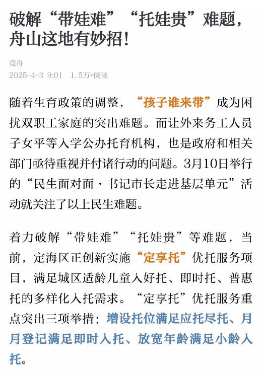 定海区创新实施“定享托”优托服务项目,满足城区适龄儿童入好托、即时托、普惠托的多样化入托需求。根据首次报名情况,作为试点幼儿园的舟山幼儿园和沁兰幼儿园计划本月开办,共有25名2~3周岁的幼儿入托(《舟山日报》4月3日报道)。“定享托”着力破解“带娃难”“带娃贵”难题,并向户籍和房产不在定海城区的外来务工人员敞开大门,好得很!