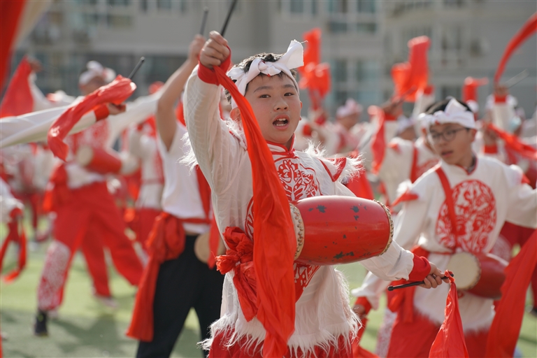4月8日,西安辅轮中学学生在阳光体育大课间30分钟练习腰鼓。