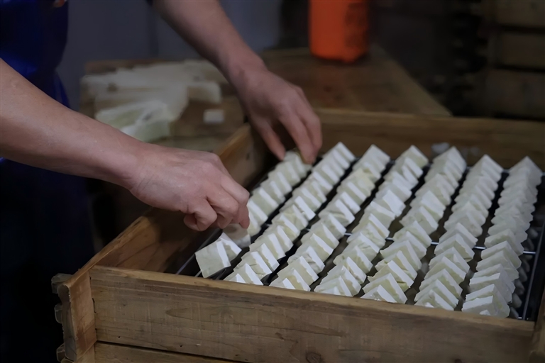 发酵室,一块块大小均匀的豆腐整齐排列,仿佛在等待一场华丽的蜕变。