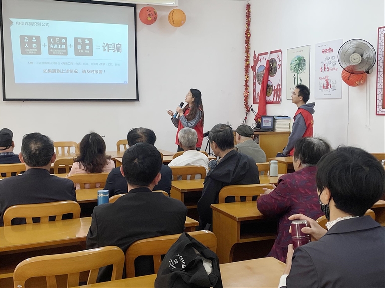 4月11日,在定海桔北社区,浙江海洋大学青年志愿者开展“银龄跨越数字鸿沟,反诈筑牢财产防线”社会实践活动。大学生们以生动的案例讲解、发放宣传资料等方式,向社区老年居民普及反诈知识,为保护老年人的财产安全贡献自己的一份力量。通讯员 史汶灵 摄