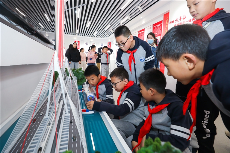 4月13日,位于定海甬舟铁路政策处理指挥部内的“火车头”先锋号项目党建展厅,小朋友们正通过文字、图片和多媒体等形式,了解甬舟铁路建设进程,理解甬舟铁路对舟山的重要意义。记者 张磊 摄