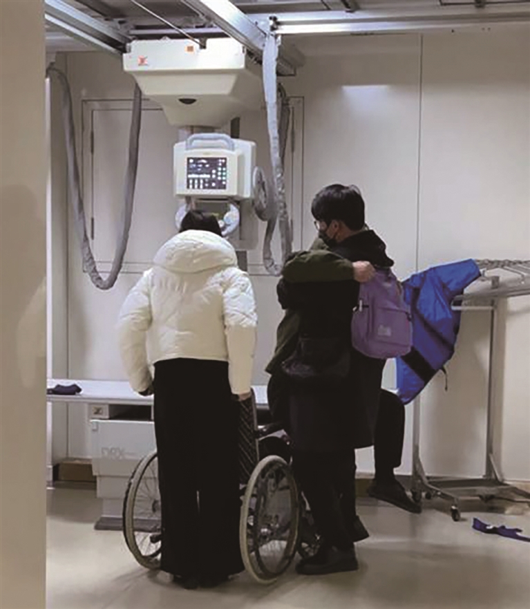 陪诊师历春升(右一)将腿脚不便的患者扶上检查台 受访者供图