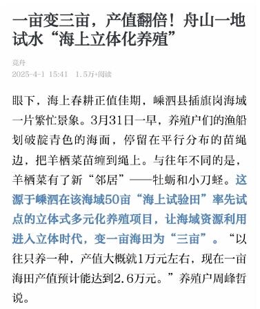 东海之上,泗礁岛畔,“蓝色梯田”层叠铺展:上层羊栖菜固碳释氧,中层牡蛎滤食净化,底层小刀蛏分解循环。嵊泗县创新的“一海三养”模式,在50亩试验海域绘就经济、生态、社会效益协同发展的新图景,为海洋经济高质量发展提供了破题样本。