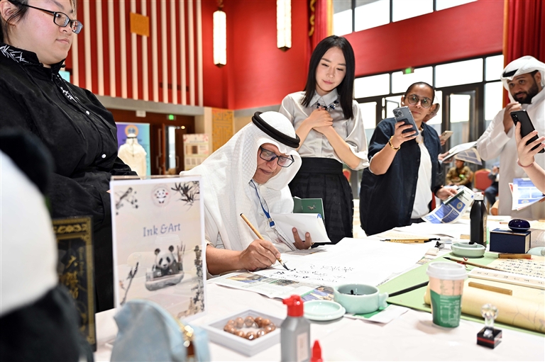 4月20日,参与者在科威特哈瓦利省举行的“国际中文日”暨使馆开放日活动中体验中国书法。