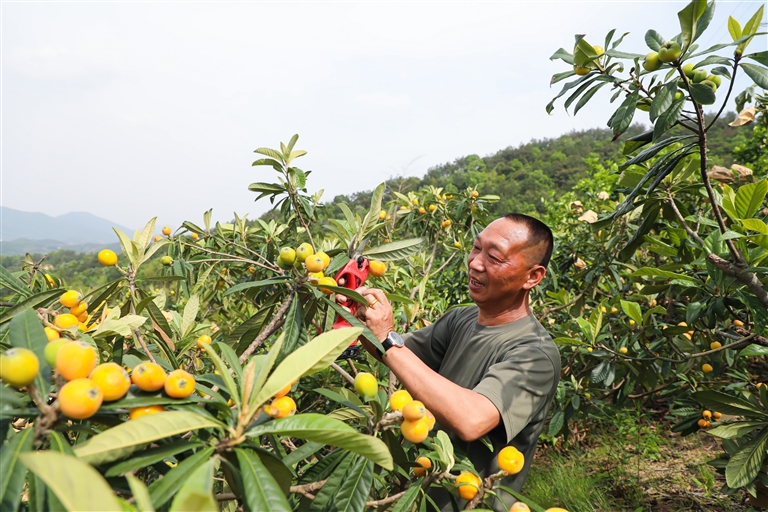 昨天,定海白泉镇皋泄村阿军家庭农场,一颗颗枇杷挂满枝头,果农们正忙着修剪枇杷树。露天种植的枇杷比大棚种植的晚熟一个月左右,也更受市场欢迎,成熟上市后预计售价达60元一公斤。记者 张磊 通讯员 庄逸 摄
