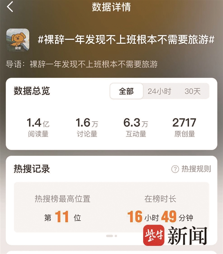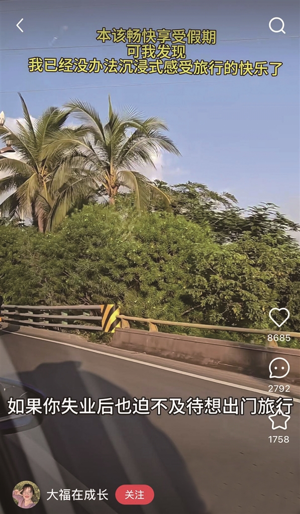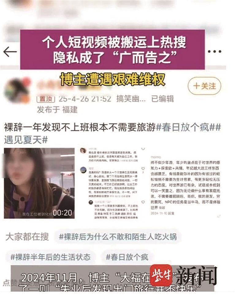 2024年11月份,博主“大福在成长”发布了一则“失业后发现出门旅行并不快乐”的视频,讲述了自己被裁员后出门旅行,实际上自己并没有那么快乐,更多的感受是无聊。此视频引发了诸多网友的共鸣,也有不少网友提出了自己的看法。今年4月26日晚上9点,一个账号未经授权,将“大福在成长”的这条视频跨平台搬运,热度迅速攀升,话题阅读量也急速攀升,讨论量也水涨船高。