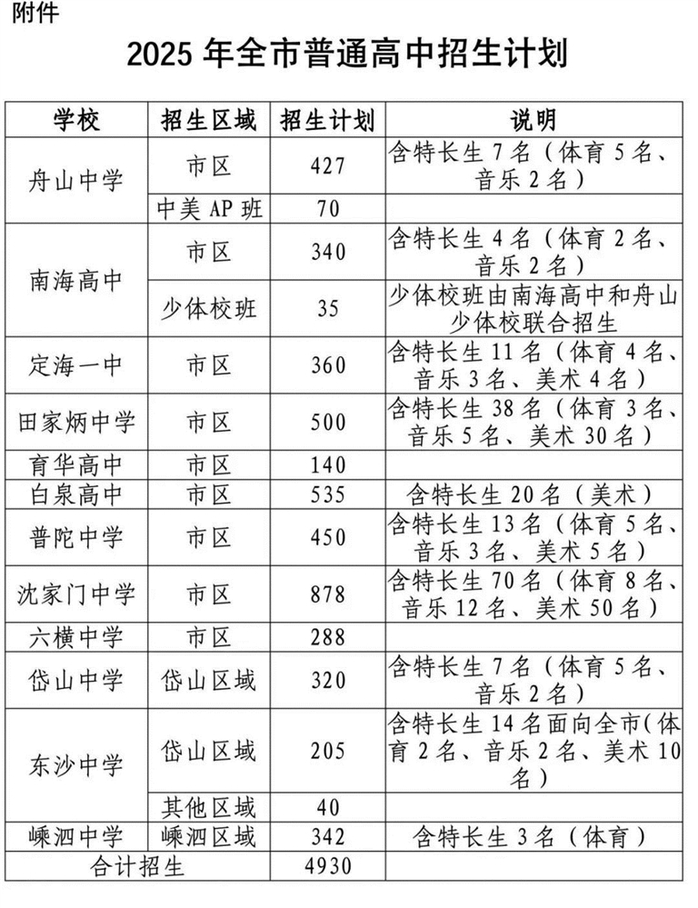 据舟山教育发布微信公众号消息 近日,舟山市教育局发布2025年全市高中段学校招生计划,2025年全市普通高中招生计划4930人,中等职业学校招生计划2982人。