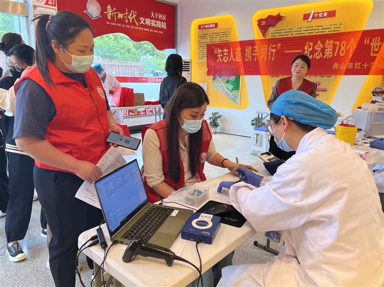 昨天下午,在普陀大干社区居委会里,普陀汇舟公益大干新居民志愿服务队的队员们参加了献血活动,市红十字会的工作人员还向队员们讲解了造血干细胞捐献的相关知识。