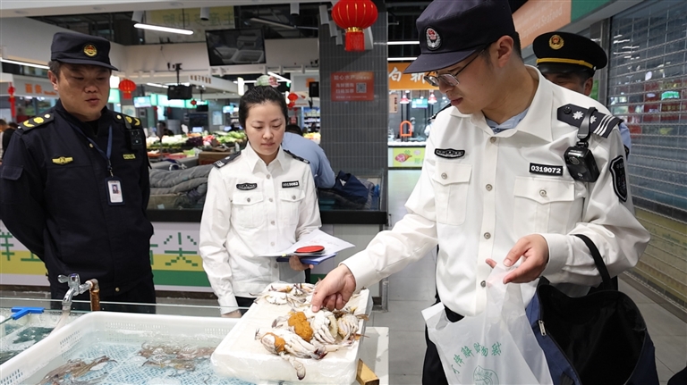 昨天,我市执法人员在新城一市场查获抱卵梭子蟹,按相关规定对摊主做出行政处罚 记者 林家豪 摄